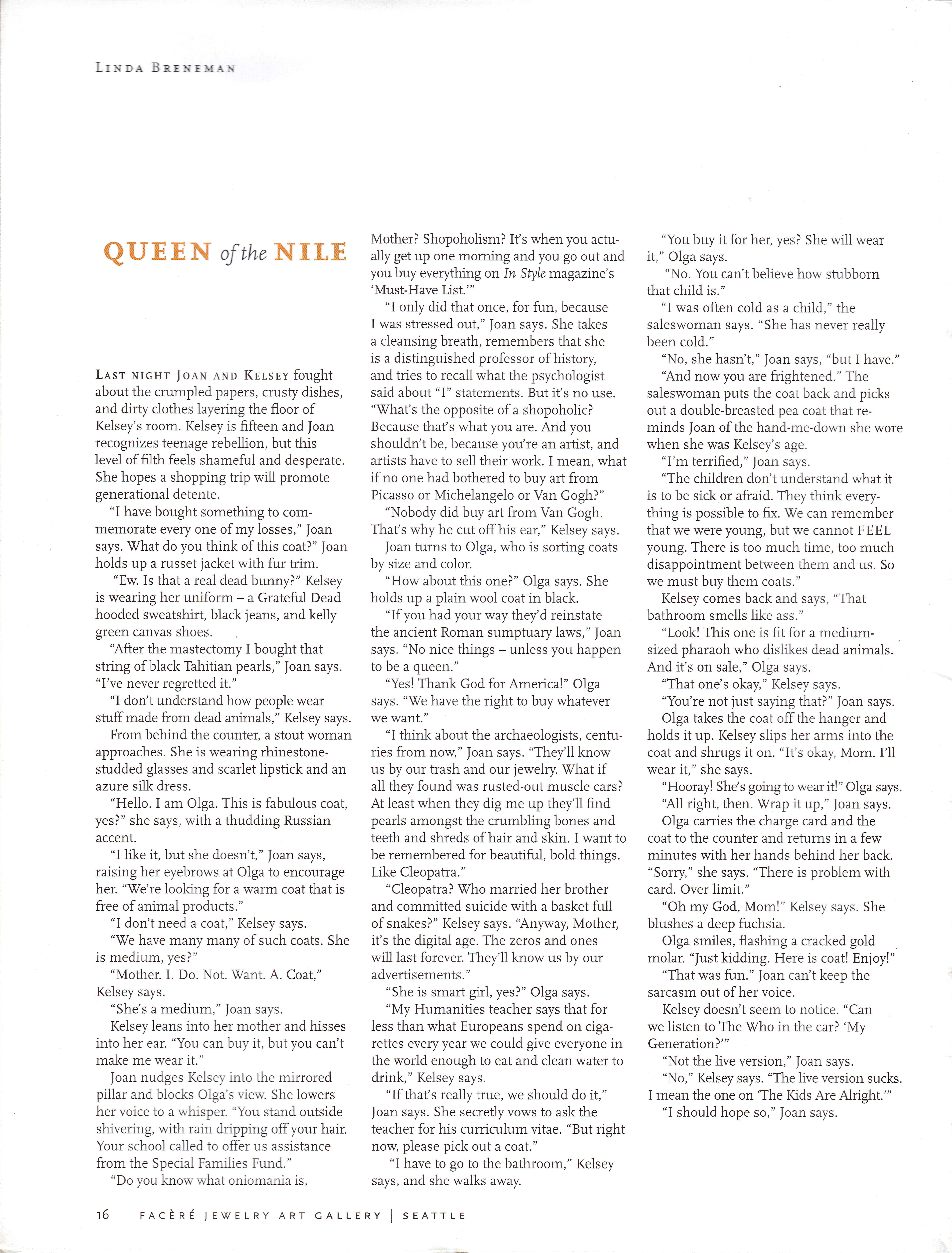 “Queen of the Nile,” Signs of Life 2007, Facere Jewelry Art Gallery, Seattle, Washington, May 2007, p. 16.